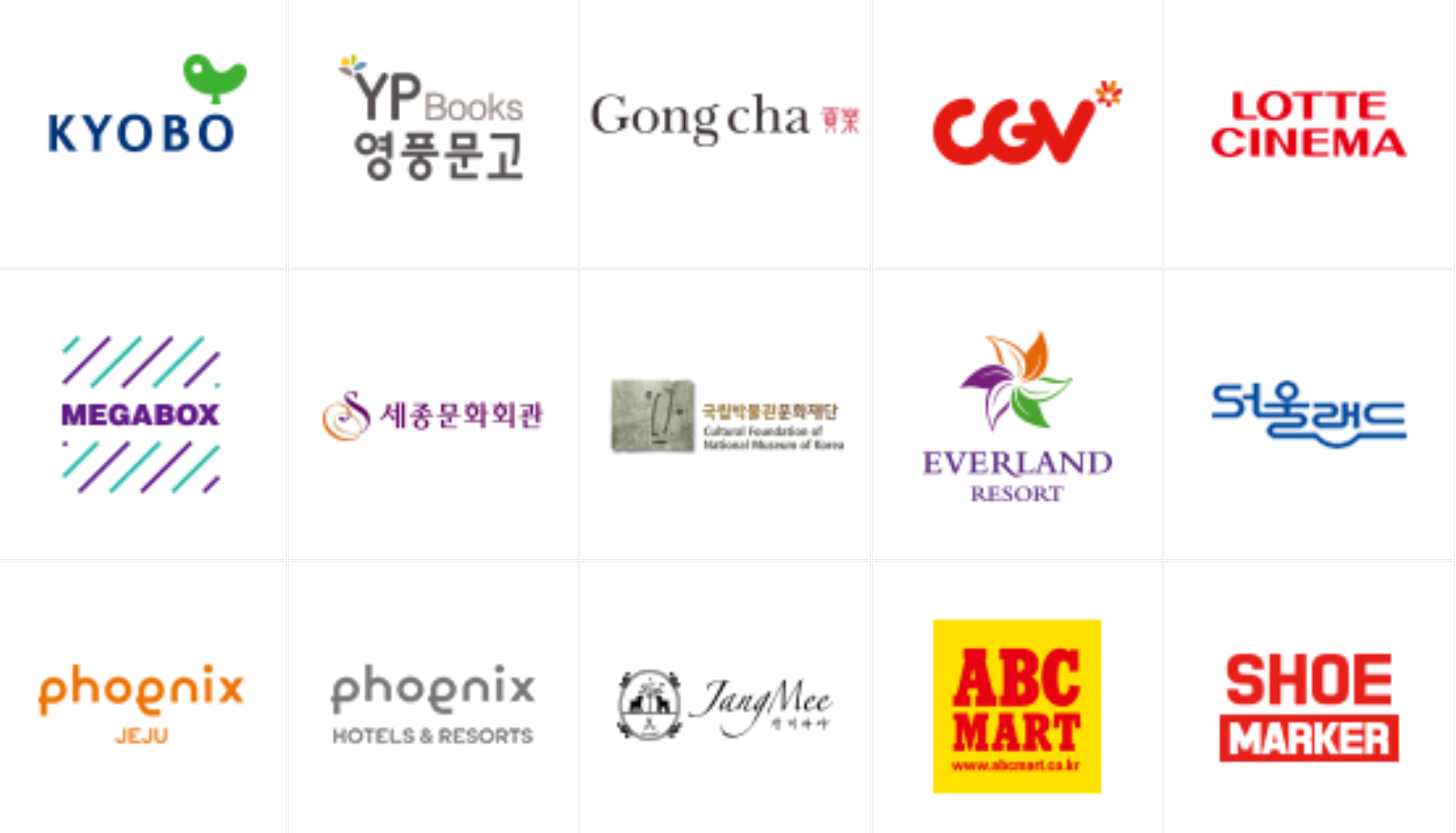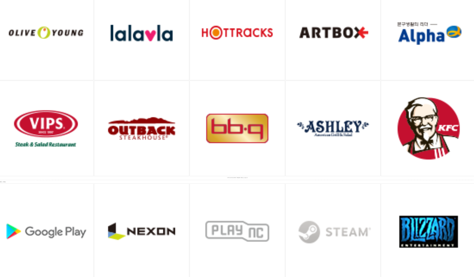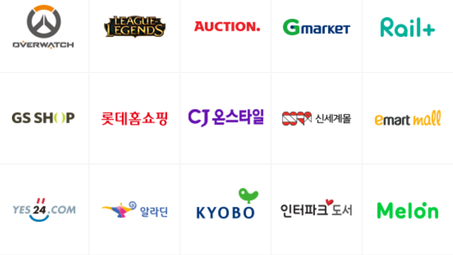 다음, 네이트, 네이버, 싸이월드, yes24 opic 인터파크도서, 멀티캠퍼스, 영풍문고, 알라딘, 리디북스, kt샵, gs shop, g마켓, g9, cj온스타일, 현대몰 현대mall, 옥션, 신세계몰, 롯데홈쇼핑, 네이버페이 , 11번가, 이마트몰, 올리브영, 소녀나라 , 지니뮤직, 삼성뮤직, 벅스뮤직, db손해보험, 티빙, 아프리카tv 해피캠퍼스, 티비포인트 카카오이모티콘, 레진코믹스